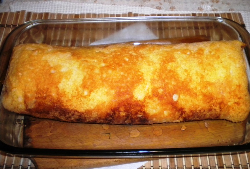 Am lasat putin sa se racoreasca in tava apoi am desprins incetisor hartia de copt. Intre timp am facut un sirop de vreo 300 ml din apa, rom si zahar (ar fi trebuit mai mult, dar asta am vazut cand am gustat din prajitura) si am insiropat blatul, apoi am uns cu gem,